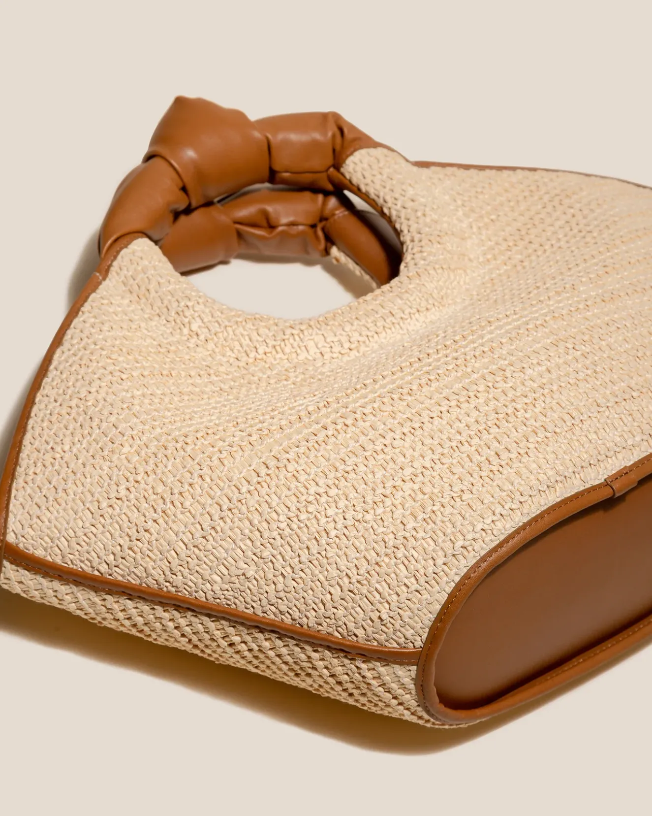 Raffia Basket Tote With Knotted Handle In Soft Calf Leather.Made In Spain By Uniquely Talented Artisans, Celebrating Excellence In Craftsmanship.
