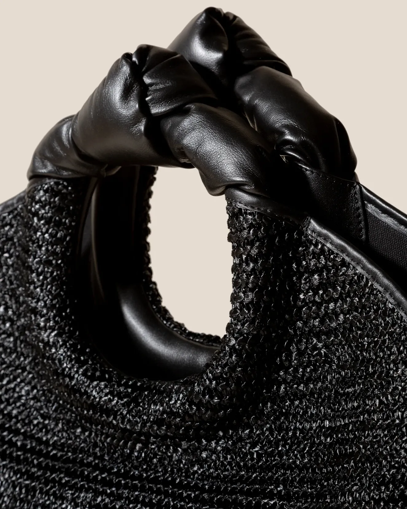 Raffia Basket Tote With Knotted Handle In Soft Calf Leather.Made In Spain By Uniquely Talented Artisans, Celebrating Excellence In Craftsmanship.