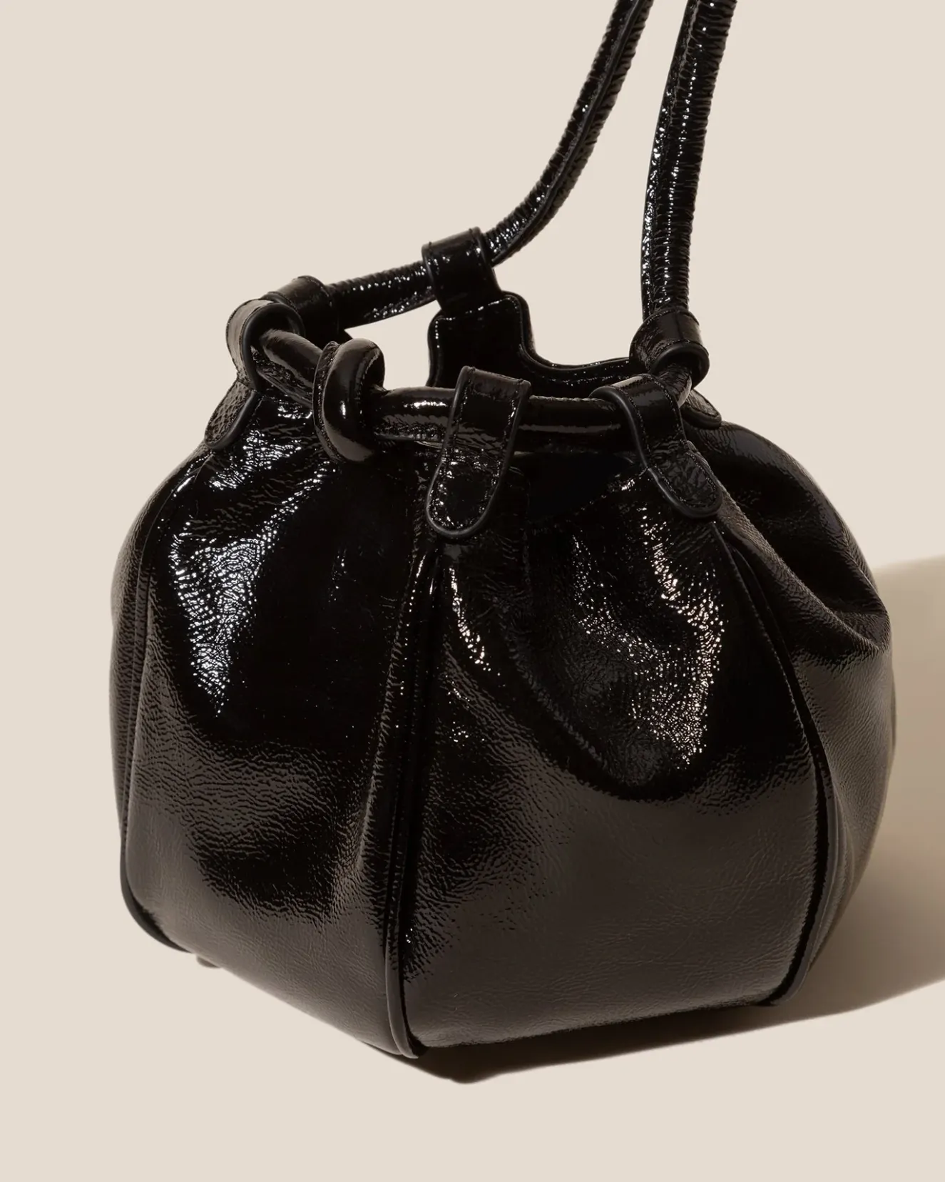 Balloon-Shaped Drawstring Crossbody/Tote Mini Bag Crafted In Crinkled Patent Italian Lambskin And Lined With Organic Cotton Canvas.It Can Be Worn As A Crossbody By Pulling The Strap To One Side, Or As As Tote By Pulling The Straps Evenly To Both Sides.Made In Spain By Uniquely Talented Artisans, Celebrating Excellence In Craftsmanship.