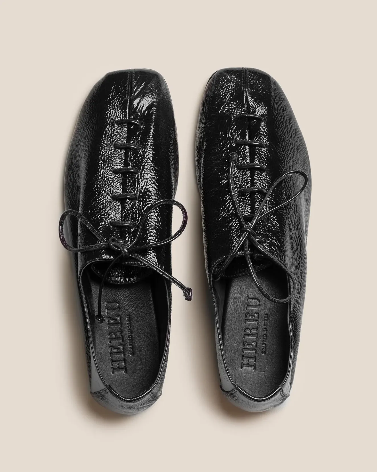 Flat Lace-Up Shoe With Bellows Tongue, Crafted In Unlined Italian Crinkled Glossy Lambskin.Made In Spain By Local Artisans, Celebrating Excellence In Craftsmanship.