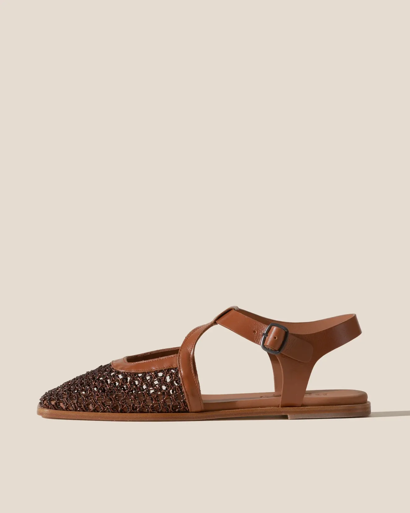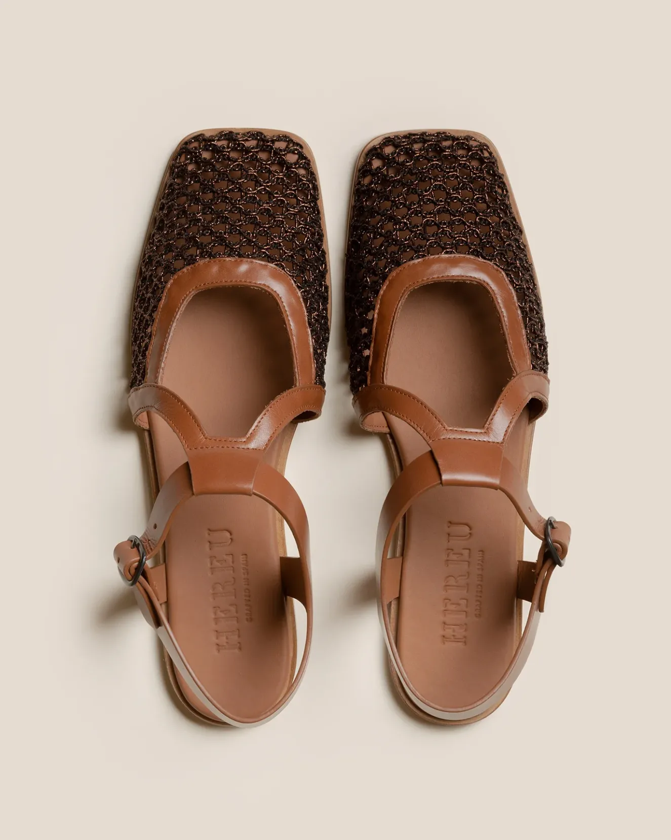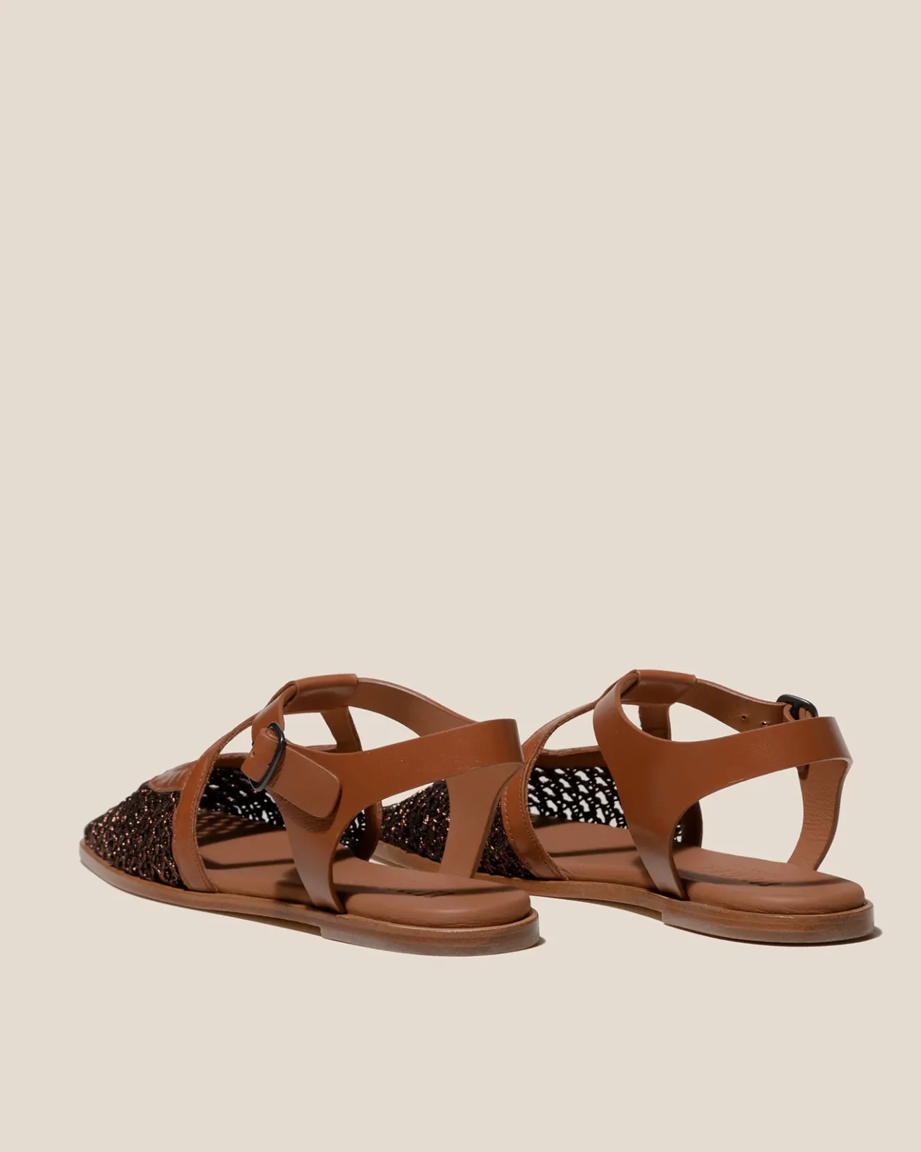 Open Back T-Bar Mesh Sandal Crafted In Structured Leather With Lurex – Cotton Mesh Detail.Made In Spain By Uniquely Talented Artisans, Celebrating Excellence In Craftsmanship.