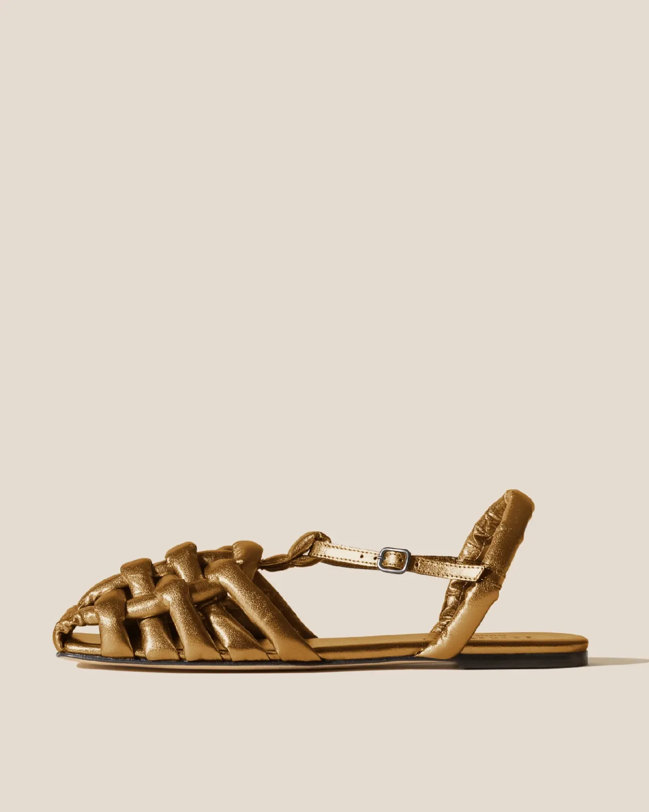 Square Toe Padded Flat Fisherman Sandal Crafted In Soft Metallic Lambskin.Made In Spain By Uniquely Talented Artisans, Celebrating Excellence In Craftsmanship.