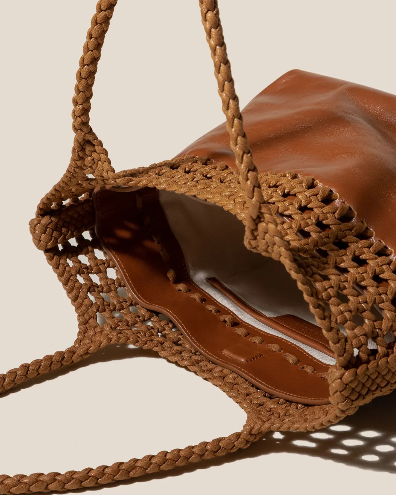 Braided Top Shoulder Bag Crafted In Polished Calf Leather And Waxed Cotton. Organic Cotton Lining.Made In Spain By Uniquely Talented Artisans, Celebrating Excellence In Craftsmanship.