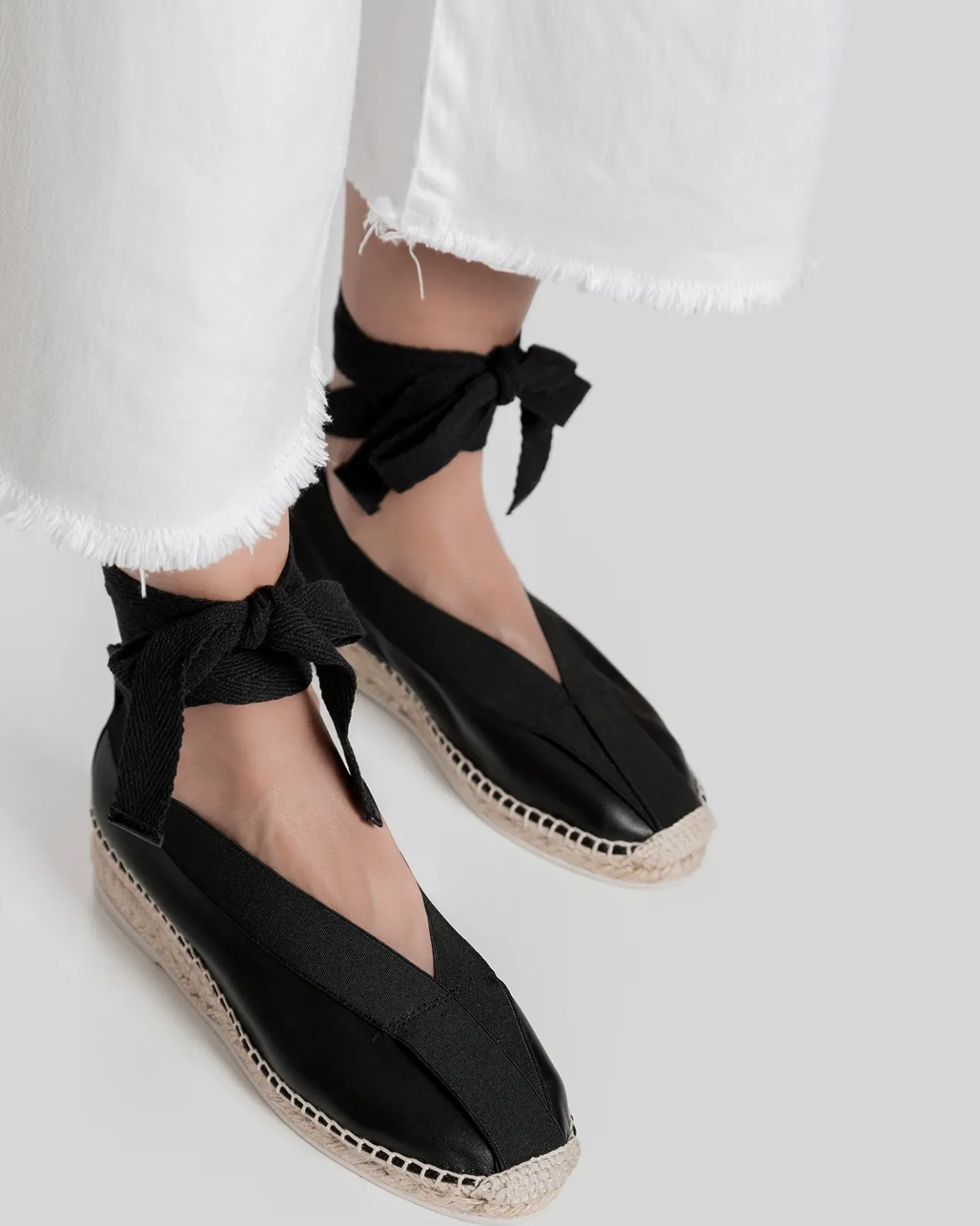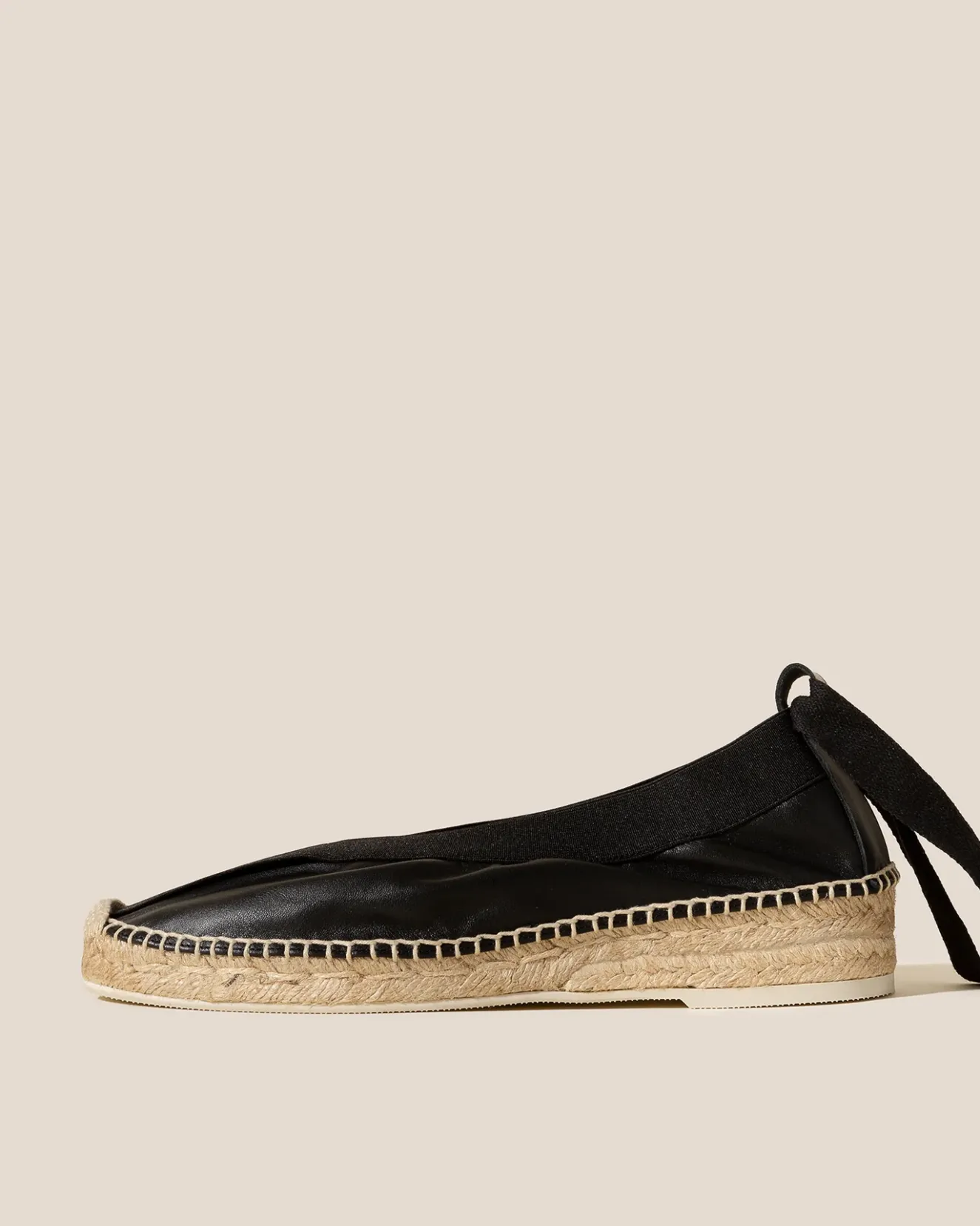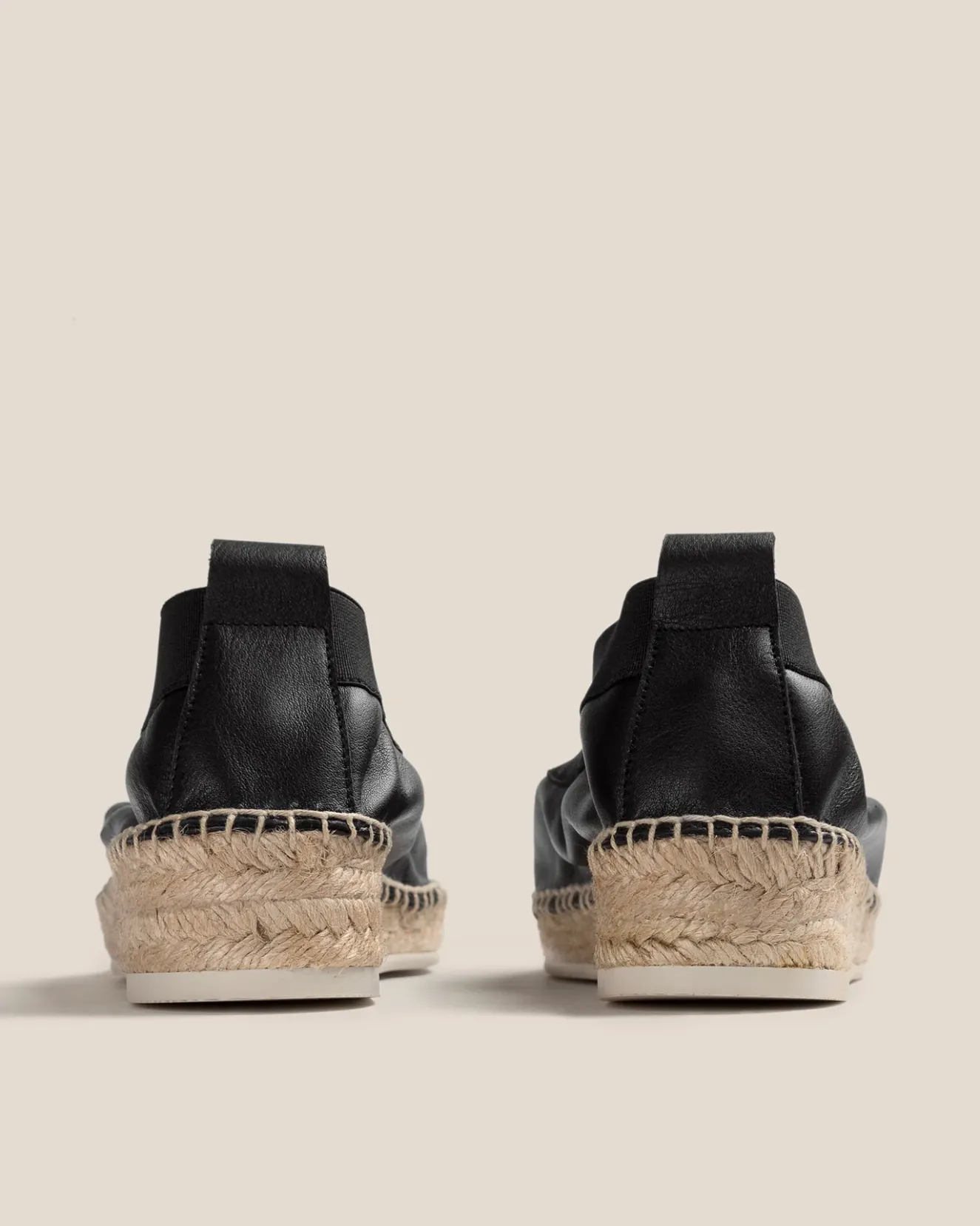 Black Round-Toe V-Cut Pump Espadrille Wedge, Crafted In Unlined Calf Leather With Elasticated Top Line.Handmade In Spain By Uniquely Talented Artisans, Celebrating Excellence In Craftsmanship.
