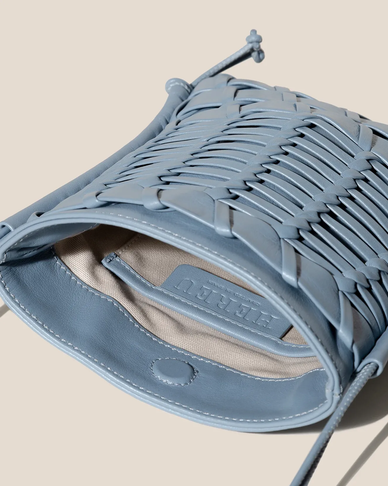 Flat Square Crossbody Bag Crafted In Soft Calf Leather, With A Handwoven Front Pocket.Made In Spain By Uniquely Talented Artisans, Celebrating Excellence In Craftsmanship.